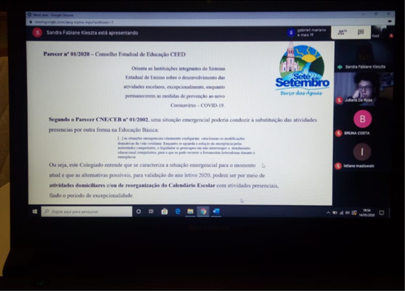 No início do mês de maio do ano letivo de 2020 a Secretaria Municipal de Educação, Desporto, Cultura e Turismo de Sete de Setembro, na pessoa do Secretário Municipal de Educação Sr. Hélio Ademar Wochniski, recebeu uma ligação telefônica da professora Universitária Karine Rudek, a qual é docente na FASA (Faculdade Santo Ângelo) convidando o município para estabelecer uma parceria no âmbito educacional tendo em vista a pandemia do COVID-19 e a suspensão das aulas presenciais. Segundo a docente universitária, a metodologia de ensino adotada pela rede municipal de ensino de Sete de Setembro é interessante e chamou a atenção das acadêmicas da Pedagogia da Fasa, as quais acompanham as atividades através das redes sociais. Na oportunidade, o secretário aderiu à proposta e convidou a coordenadora pedagógica Sandra Fabiane Kleszta, responsável pelo pedagógico da secretaria para apresentar o relatório e as atividades realizadas nas três escolas da rede municipal de ensino de nosso município: Emei Primeiros Passos, EMEF Sargento Pedro Krinski e EMEF Gaúcha, as quais desenvolveram as AULAS PROGRAMADAS, seguindo a proposta da rede estadual de ensino, pois como o município não possui sistema próprio de ensino, o mesmo passa a compor com o estado, o sistema único de ensino. Em conversa com a professora responsável pelo componente curricular, neste período letivo as acadêmicas estariam visitando as escolas para conhecer a prática e a realidade da sala de aula. Tendo em vista a suspensão das aulas presenciais e as escolas fechadas, a mesma buscou trazer para a aula a “escola” visto que as acadêmicas encontram-se impossibilitas nesse momento de visitar os espaços escolares. Utilizando a tecnologia como recurso pedagógico na data de 14 de maio de 2020 (quinta-feira à noite) no período da aula de Currículo e Escola, a qual é de responsabilidade da professora Karine Rudek, a professora Sandra Fabiane Kleszta participou da aula apresentando as atividades desenvolvidas nesse período de suspensão das aulas presenciais, bem como toda a legalidade que segue. Agradecemos a oportunidade e parabenizamos a FASA e seus docentes, por tão importante iniciativa, visando diminuir os prejuízos na aprendizagem no ensino superior. Colocamo-nos a disposição para compartilhar e acolher ideias em prol da qualidade da educação em Sete de Setembro.