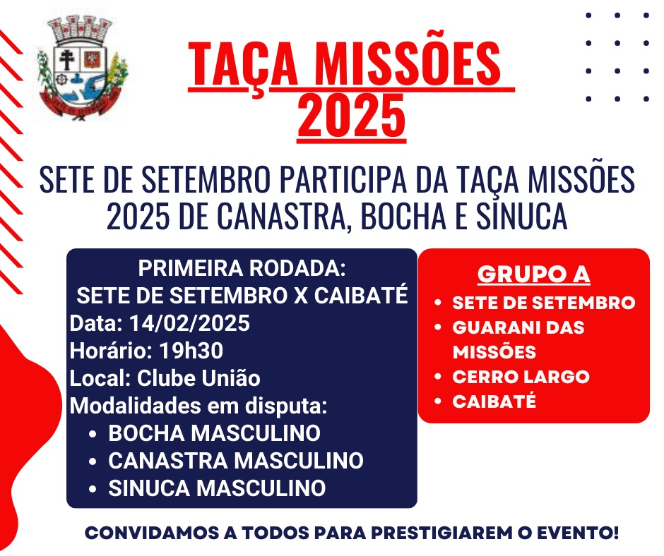 O Conselho Municipal de Desporto com apoio da Administração Municipal, informa que o município de Sete de Setembro está integrado na Taça Missões 2025 de canastra, bocha e sinuca, juntamente com os demais municípios que compõe a Associação dos Municípios das Missões - AMM. Sete de Setembro, Guarani das Missões, Cerro Largo e Caibaté compõem o Grupo A da competição. Na sexta-feira, dia 14 de fevereiro de 2025, as 19h30, acontecerá, junto ao Clube União, a primeira rodada da Taça Missões 2025, onde Sete de Setembro enfrentará Caibaté nas seguintes modalidades: bocha masculino, canastra masculino e sinuca masculino. Convidamos a todos para participarem deste evento