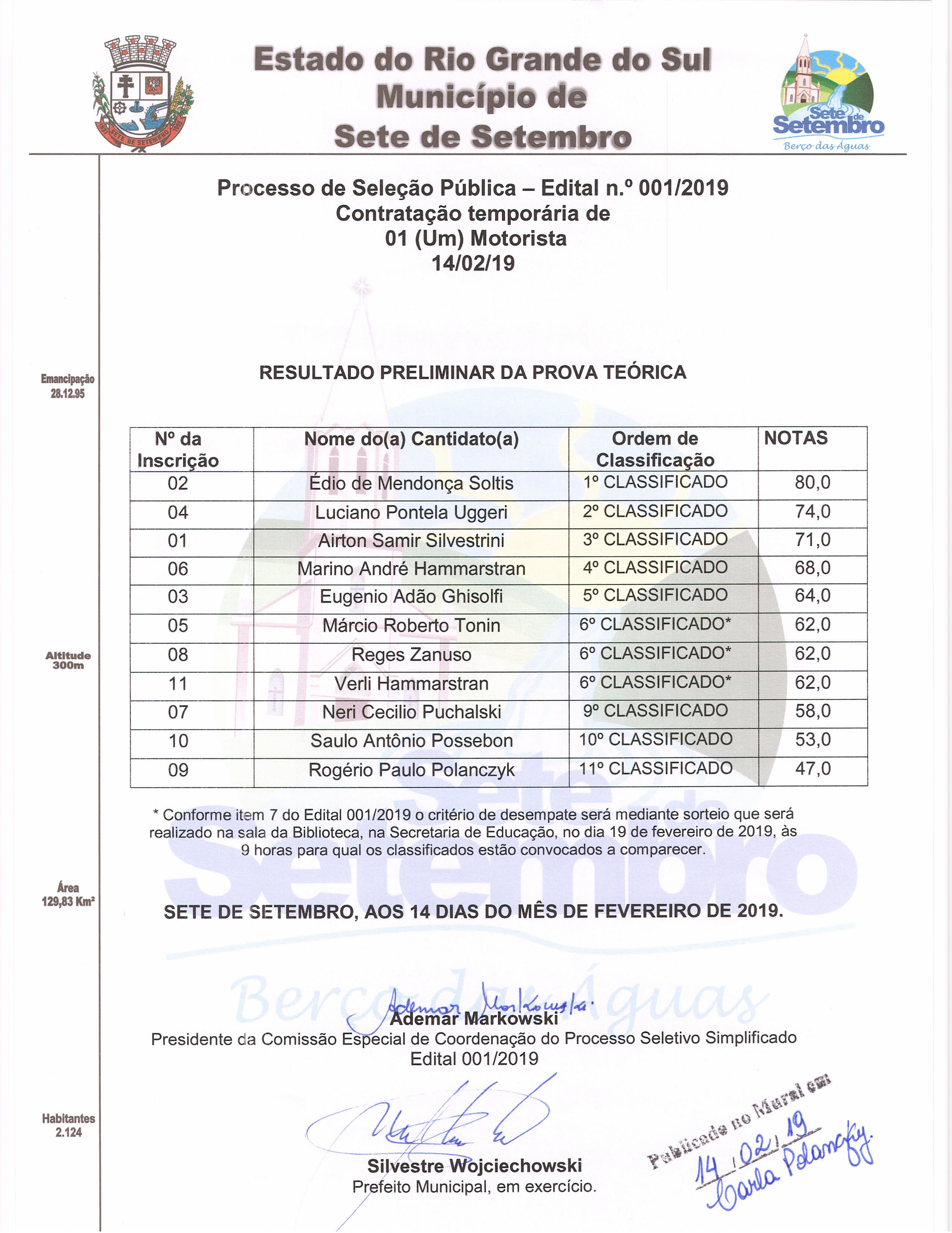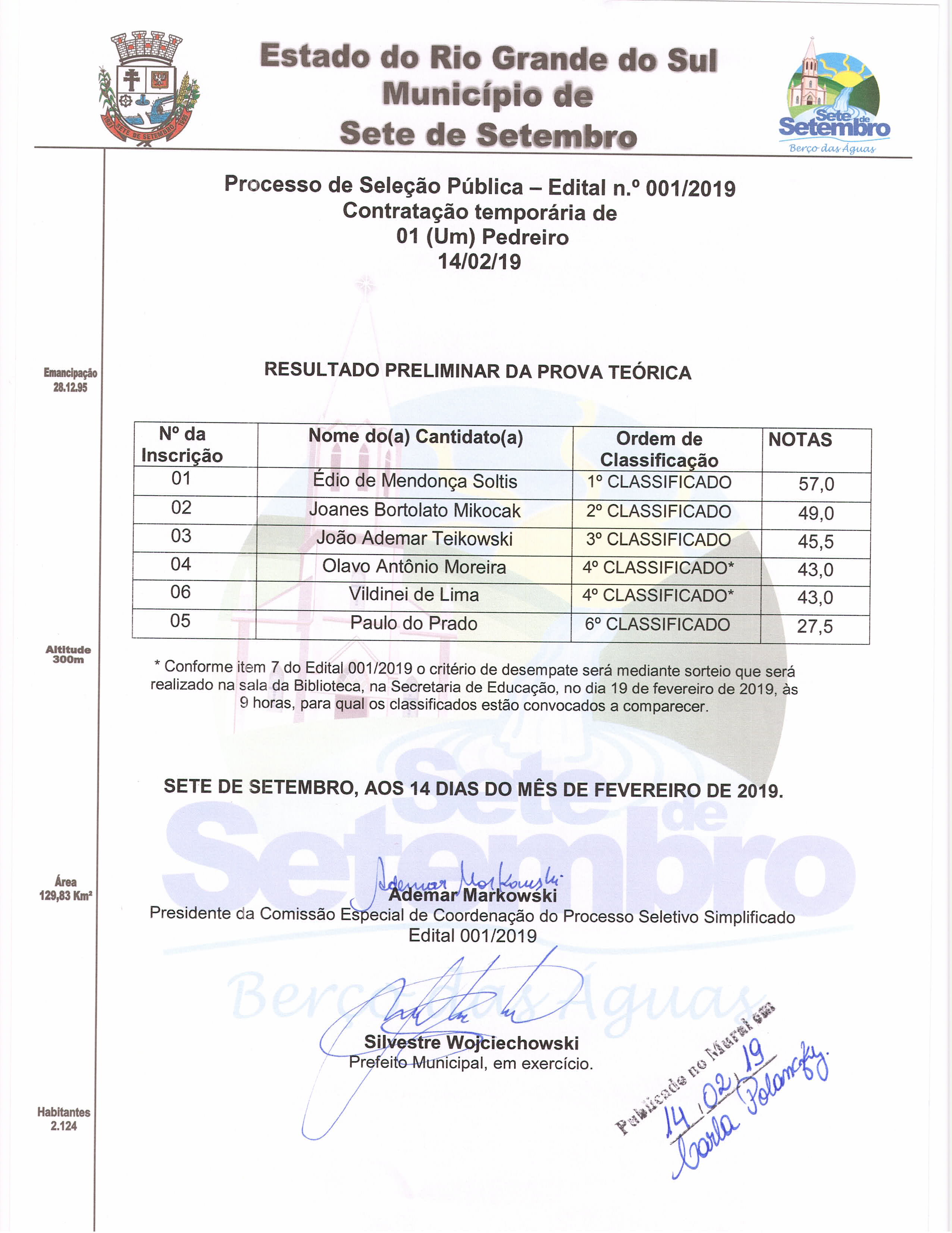 Observações: Inscrições de 29/01/2019 a 07/02/2019, na Secretaria Municipal de Administração e Planejamento.Rua Edmundo Grassel 1245, Centro, Sete de Setembro/RS, mais informações pelo fone: 55 3614 2318.